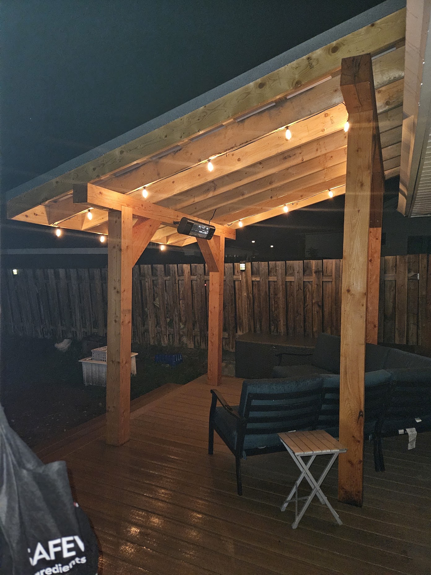 Custom timber frame pavilion and deck build at night by Hand and Hammer in Cranbrook, BC, featuring Edison string lights and an integrated outdoor heater.